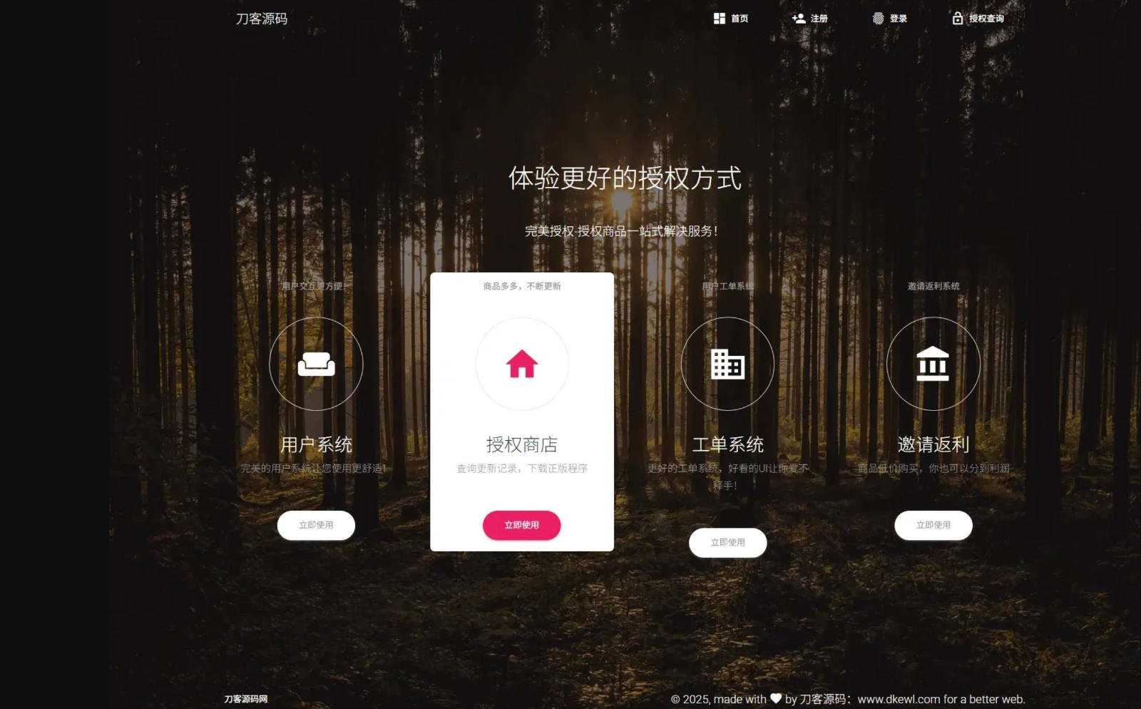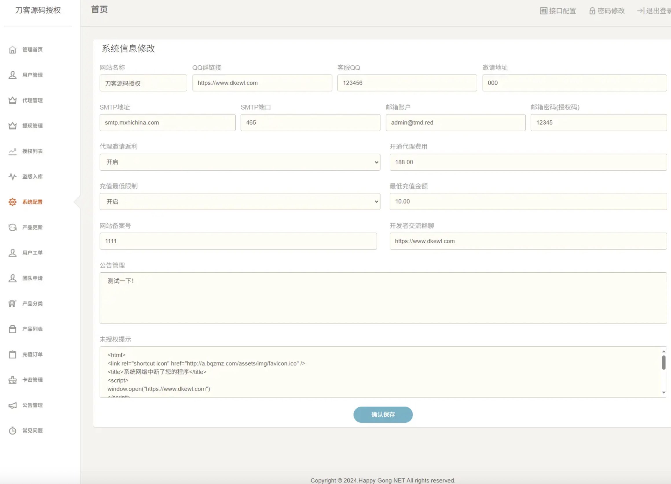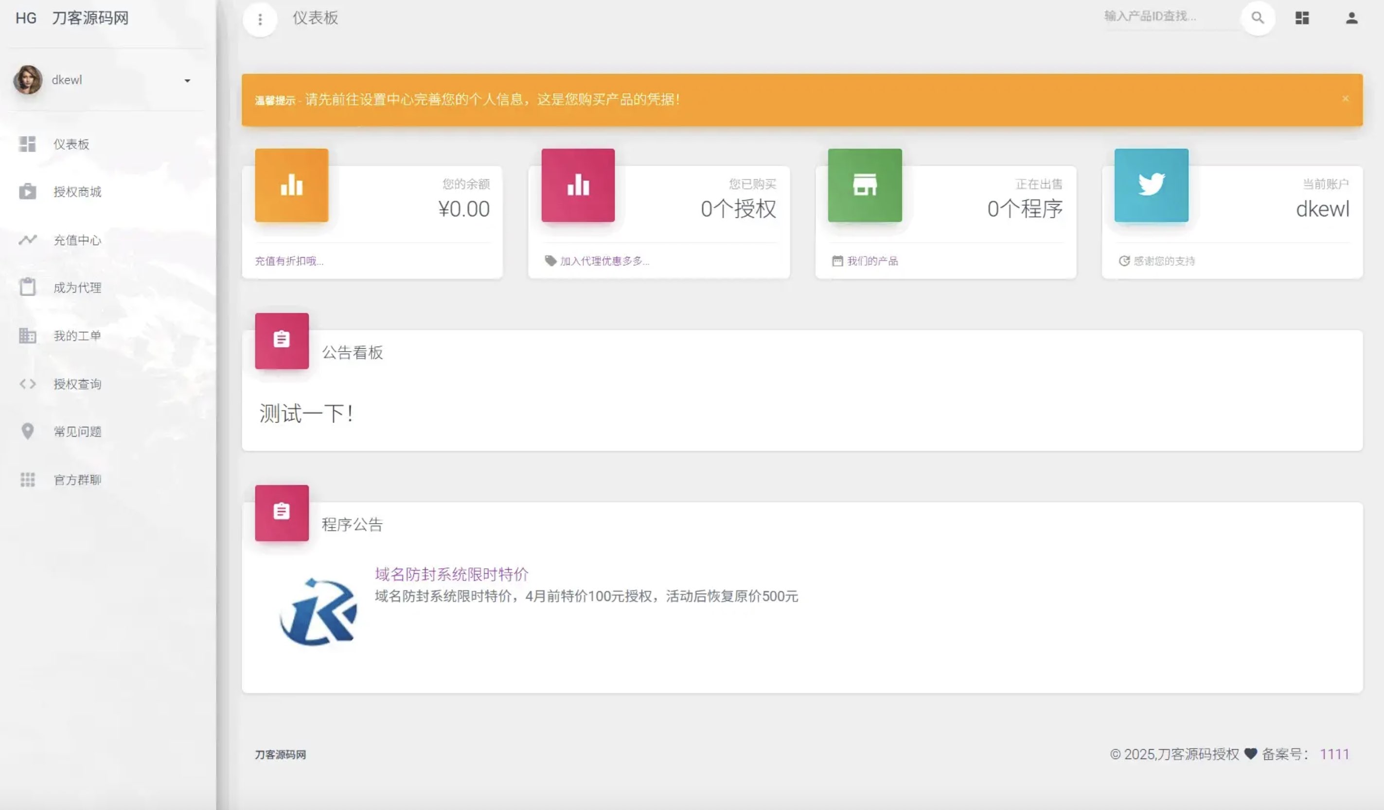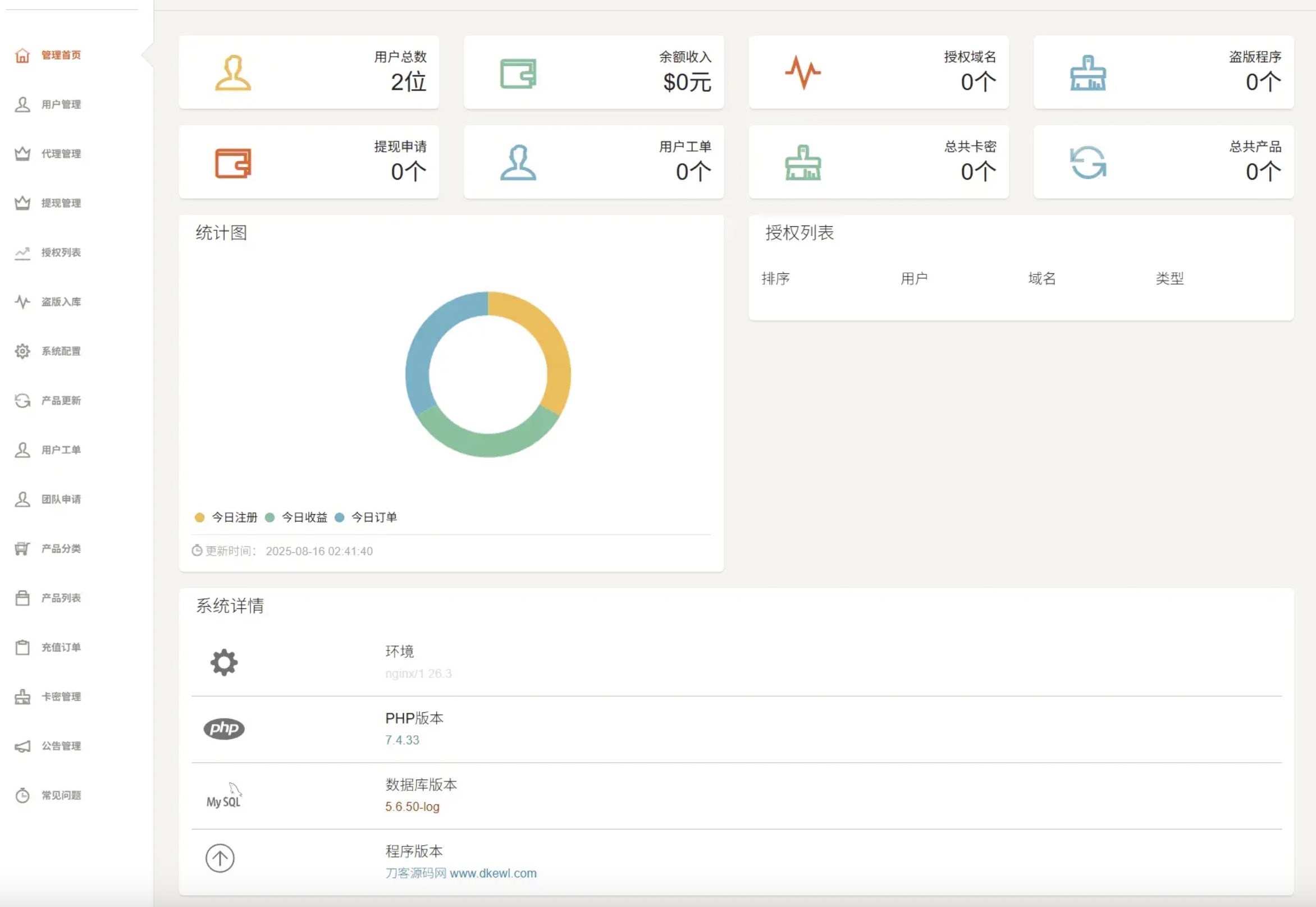 简介: PHP域名授权系统网站源码/授权管理工单系统/精美UI/附教程 功能最多的授权系统,用户系统,工单系统,精美UI,支付系统,授权管理,产品更新,更新详情,代理返利,发卡系统,授权系统,盗版入库,团队模式,常见问题,等你来体验! 自带首页二套模板主题可随意更换替换等。 真正云端管控 域名授权验证/IP验证/域名+IP+时间三重验证,这一切仅需在云端即可完成,不需要在客户端做任何修改。 只需一段代码即可完成 将代码在保持功能的前提下,做到很好的精简,现在您只需将一段代码放在用户系统中,就能实现授权管理。 您可以将授权代码插入到您的系统单独授权,也可以很轻松的整合到您的系统中,您也可以像传统软件那样填写授权码进行授权,接下来您要做的,仅仅就是在云控制端给用户分配授权码即可。 图片: