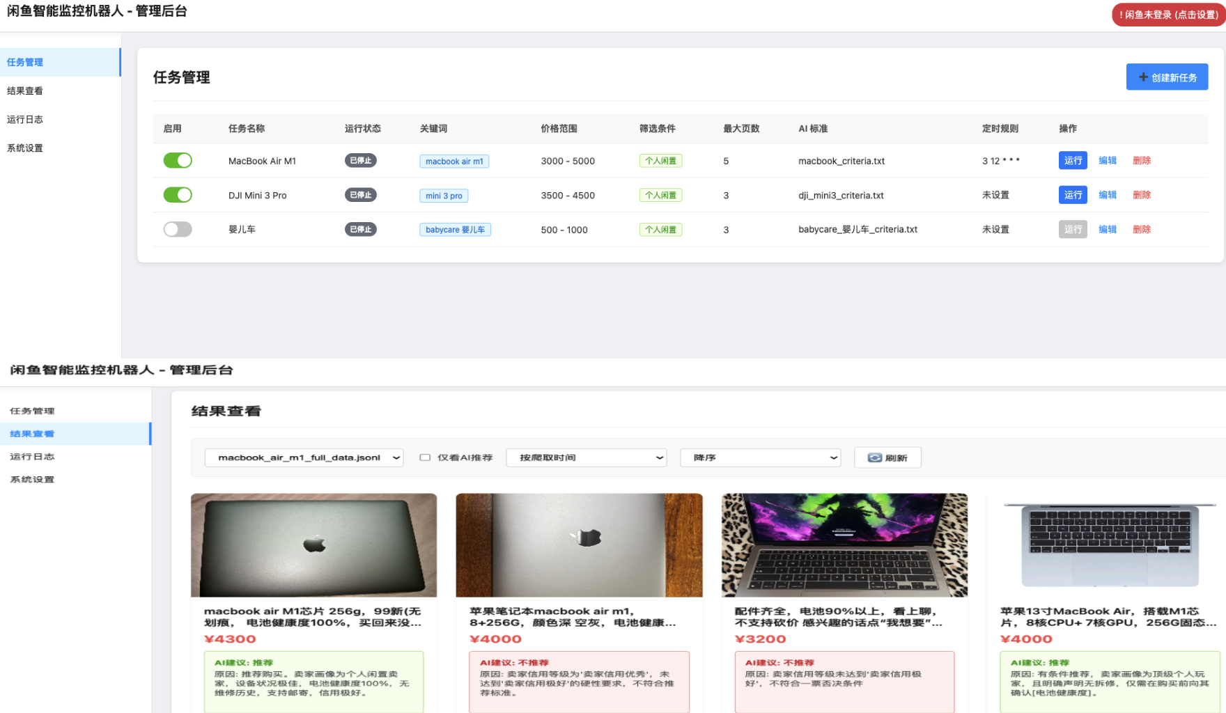 简介: 一个基于 Playwright 和AI过滤分析的闲鱼多任务实时监控与智能分析工具,配备了功能完善的 Web 管理界面。 可视化Web界面: 提供完整的Web UI,支持任务的可视化管理、AI标准在线编辑、运行日志实时查看和结果筛选浏览,无需直接操作命令行和配置文件。AI驱动的任务创建: 只需用自然语言描述你的购买需求,即可一键创建包含复杂筛选逻辑的全新监控任务。多任务并发: 通过 config.json 同时监控多个关键词,各任务独立运行,互不干扰。实时流式处理: 发现新商品后,立即进入分析流程,告别批处理延迟。深度AI分析: 集成多模态大语言模型(如 GPT-4o),结合商品图文和卖家画像进行深度分析,精准筛选。高度可定制: 每个监控任务均可配置独立的关键词、价格范围、筛选条件和AI分析指令 (Prompt)。即时通知: 支持通过 ntfy.sh、企业微信机器人和 Bark,将符合AI推荐的商品立即推送到你的手机或桌面。定时任务调度: 支持 Cron 表达式,可为每个任务设置独立的定时执行计划。Docker 一键部署: 提供 docker-compose 配置,实现快速、标准化的容器化部署。健壮的反爬策略: 模拟真人操作,包含多种随机延迟和用户行为,提高稳定性。 图片: